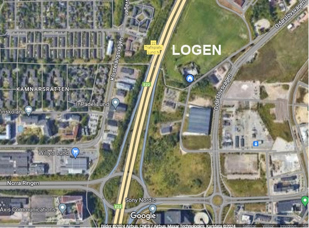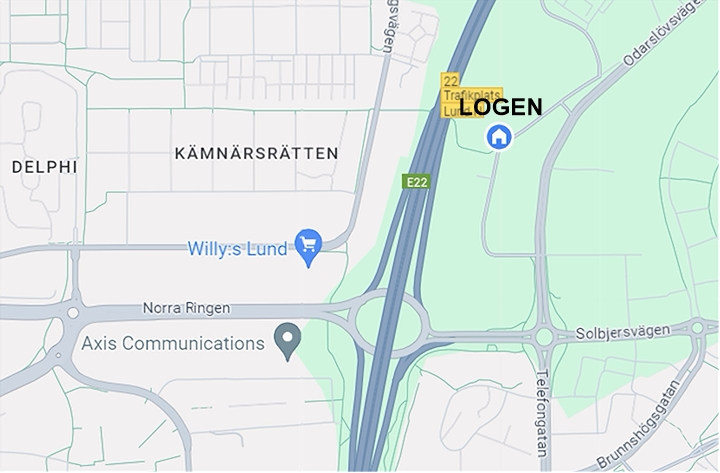 Alternativt efter sista rondellen: Följ vägen (till vänster ligger ett parkeringshus) ca 100m. Där finns ytterligare en skylt med Logen i Lund. Sväng vänster. Sväng vänster genast igen. LOGEN ligger på gården ca 100 m ner på höger sida.