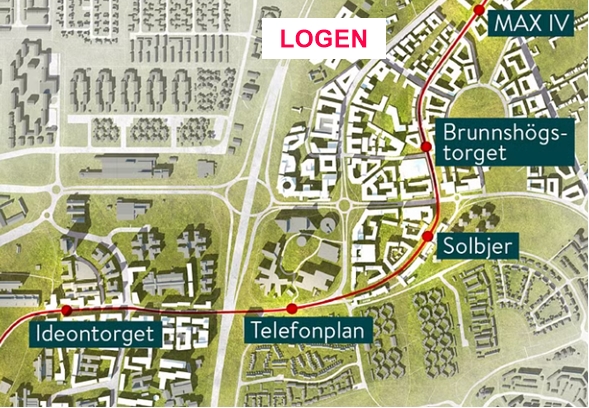 Gå av vid Brunnshögstorget. Gå över Odarslövsvägen till vänster. Mellan parkeringshuset och en liten trädplantering finns en cykel/gångväg som leder ner till Logen.